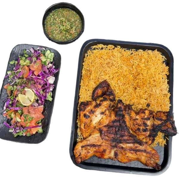 Whole grilled chicken with rice, salad, and spicy sauce.